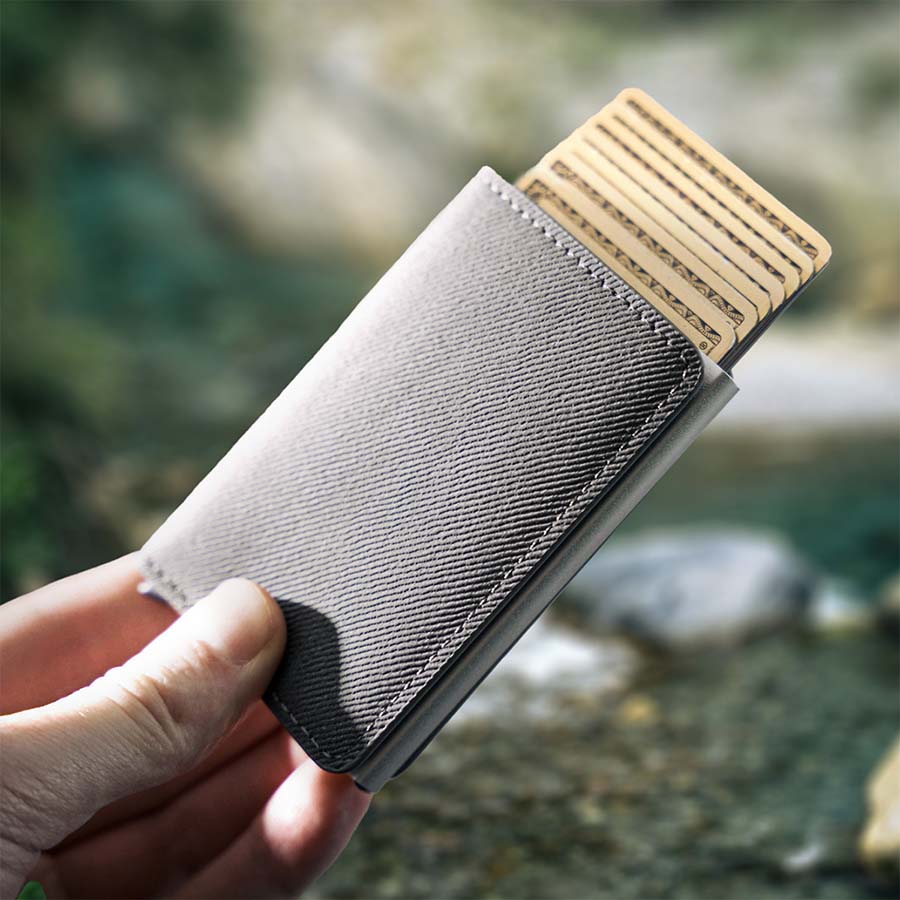 Our treated aluminum chamber holds cards snug with a spring loaded mechanism. This keeps cards from falling out on accident - especially in pockets.